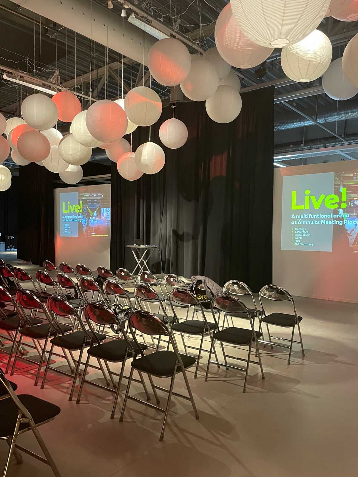 I moderna och luftiga lokaler på Live! finns plats för 1 400 sittande deltagare eller cirka 2 300 stående. Live! ligger på markplan och hela huset är handikappanpassat. I entrén finns en stor obemannad garderob. Det finns gott om toaletter och städning ingår alltid i priset.